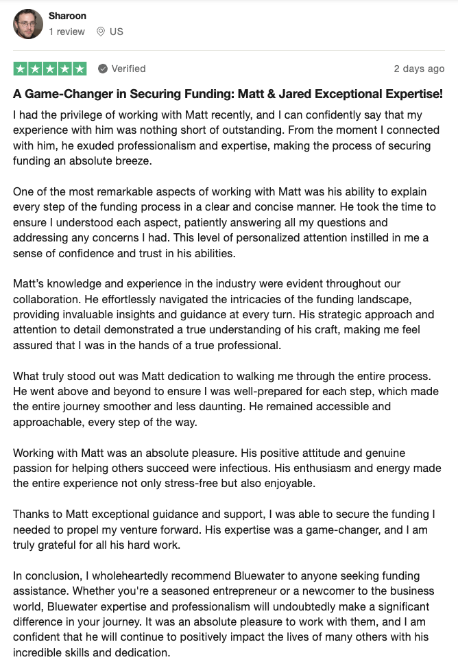 Ravinder, a real estate investor, couldn’t get a construction loan and was ready to sell his building just to stop the financial drain. After a bad experience with another funding company, he gave Bluewater a chance. With our help he secured $107,000 in 0% funding — enough to restart construction, pay contractors, and move the project forward. And we’re not done yet — we’re still working together toward his full $150,000 funding goal. He’s now confident, funded, and grateful for the transparency and support he didn’t get elsewhere.